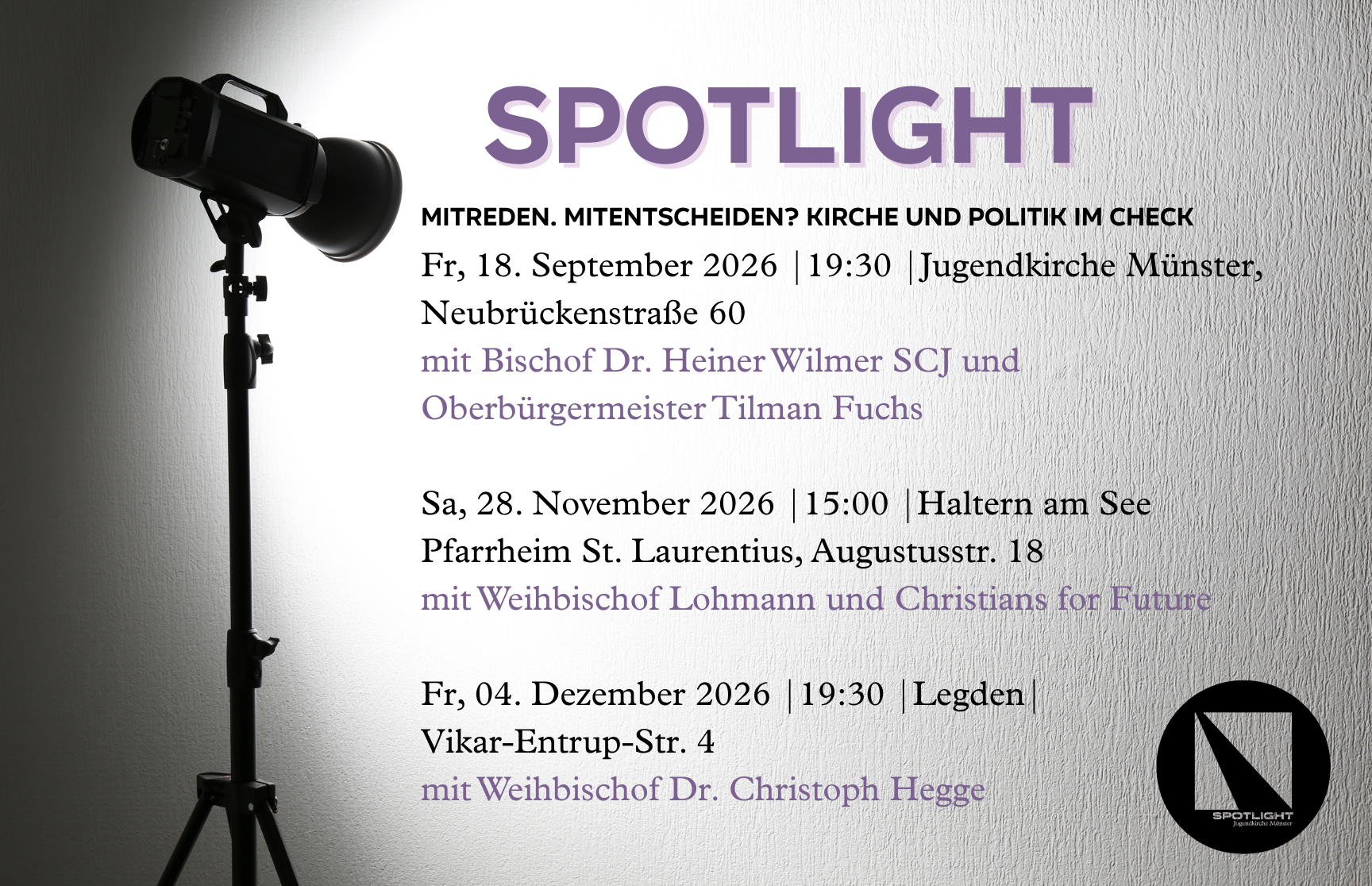 Seit März 2025 ist „Spotlight“ ein neues Format im Programm der Jugendkirche. Es lädt junge Menschen dazu ein, die Weihbischöfe und den neuen Bischof persönlich kennenzulernen, jenseits formeller Anlässe, im direkten Austausch und in einer offenen Atmosphäre.